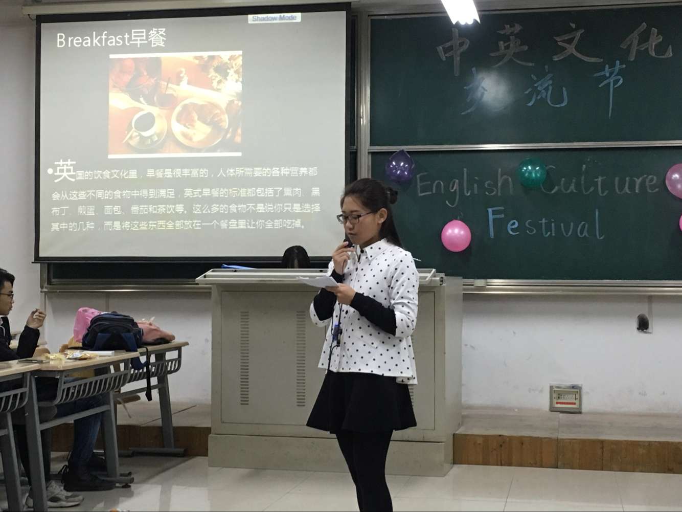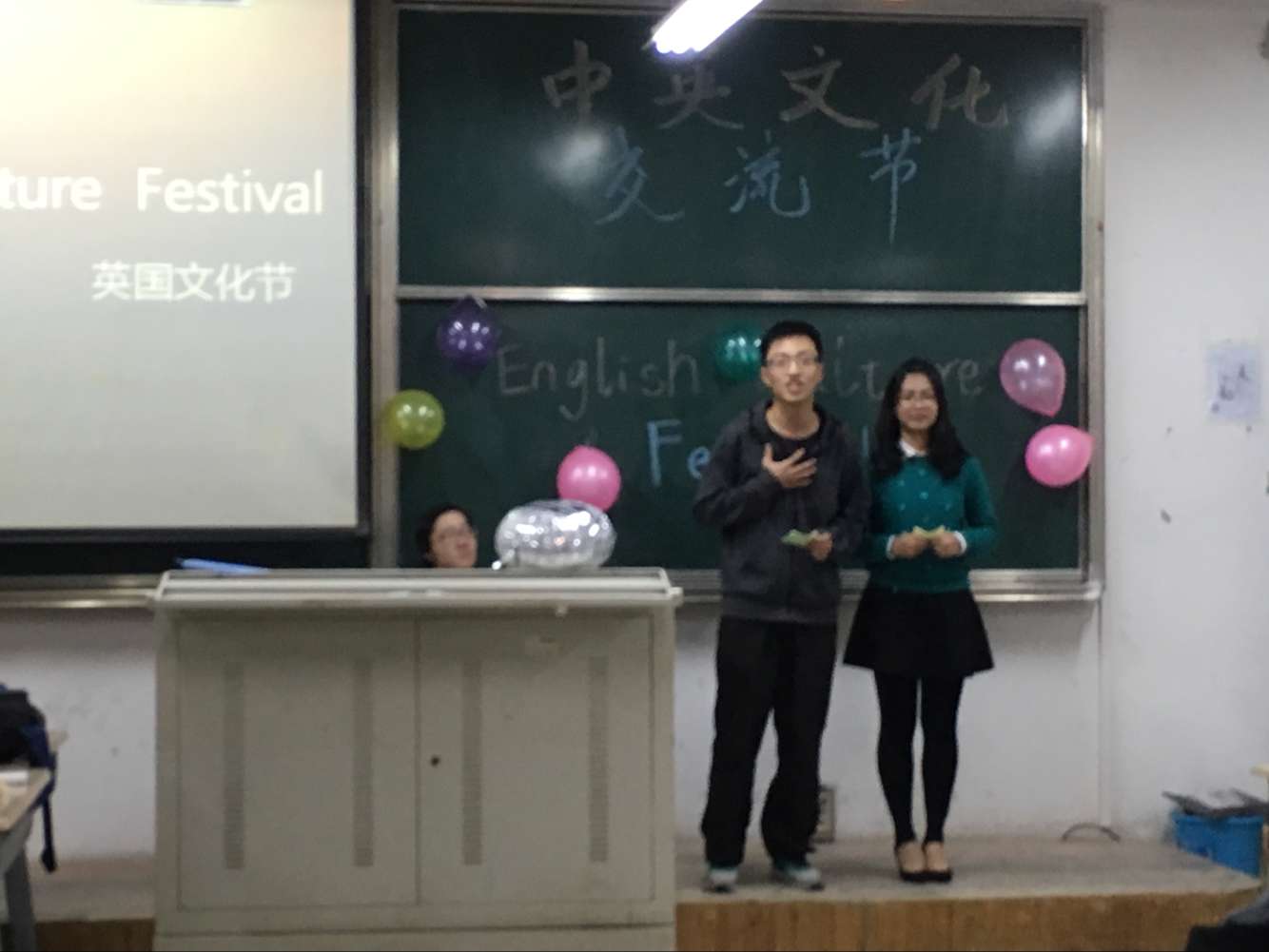 寒冷的天气并没有阻挡同学们的热情,在主持人精彩的开场白后,活动正式开始。活动首先介绍了英国的历史、餐饮、礼仪、节日等文化;还开展了如U Draw & I Guess 和 To Pass the Parcel的一系列游戏,轻松有趣,点燃了节日的气氛。接下来的小合唱、情景表演、演讲等节目各具特色,让人眼前一亮。