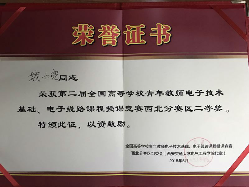 2018年5月26日,在西安交通大学举行了第二届全国高等学校青年教师电子技术基础、电子线路课程授课竞赛西北区分赛。此次授课竞赛西北地区20所高校、总计41名青年教师参赛。参赛课程分为:模拟电子技术基础、数字电子技术基础、电子线路Ⅰ(低频)、电子线路Ⅱ(高频),数字电路与逻辑设计,经过各组评委对参赛选手的说课及授课评分,共评选出一等奖9名(数电组3名,模电组、逻辑组各2名,电子线路低频、高频各1名),二等奖17名。
