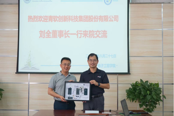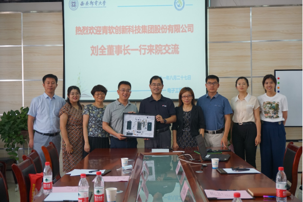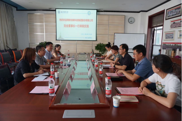2021年8月27日,青软创新科技集团股份有限公司刘全董事长一行5人来欧洲杯官网进行合作交流,欧洲杯官网副校长卢光跃教授,welcome欧洲杯官网院长杜慧敏、副院长邓军勇等人参加座谈。
